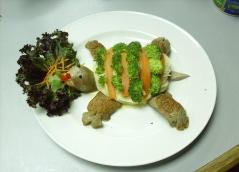 | Turtle (cryptodira rainbowgensis) made from Weisswurst, Mashed Potatoes, Broccoli and Carrots. |